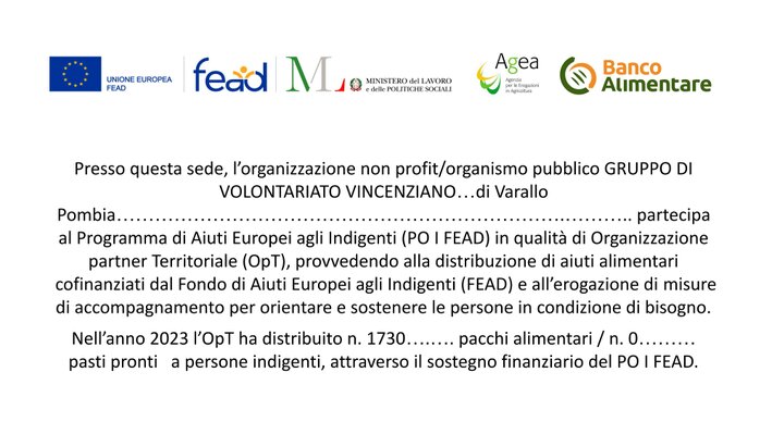 Come da richiesta del Banco Alimentare per dare visibilità a quanto ricevuto dal programma Fead, rendiamo pubblici i dati relativi agli aiuti distribuiti.